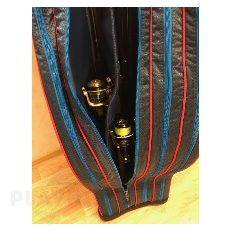 Полужесткий чехол Волжанка Про Спорт 4+4. Имеются 4 отсека, в каждый из которых помещается пара удилищ. Одно с транспортной длиной 160 см, другое 180 см. Короткое удилище крепится в специальный кармашек, расположенный выше другого. Благодаря этому, удилища с собранными катушками не оказывают друг на друга механического воздействия. Усиленные молнии обеспечат долгую эксплуатацию. Удобный плечевой ремень имеет мягкую вставку, и регулируется по длине. Основание чехла обшито плотным непромокаемым материалом.