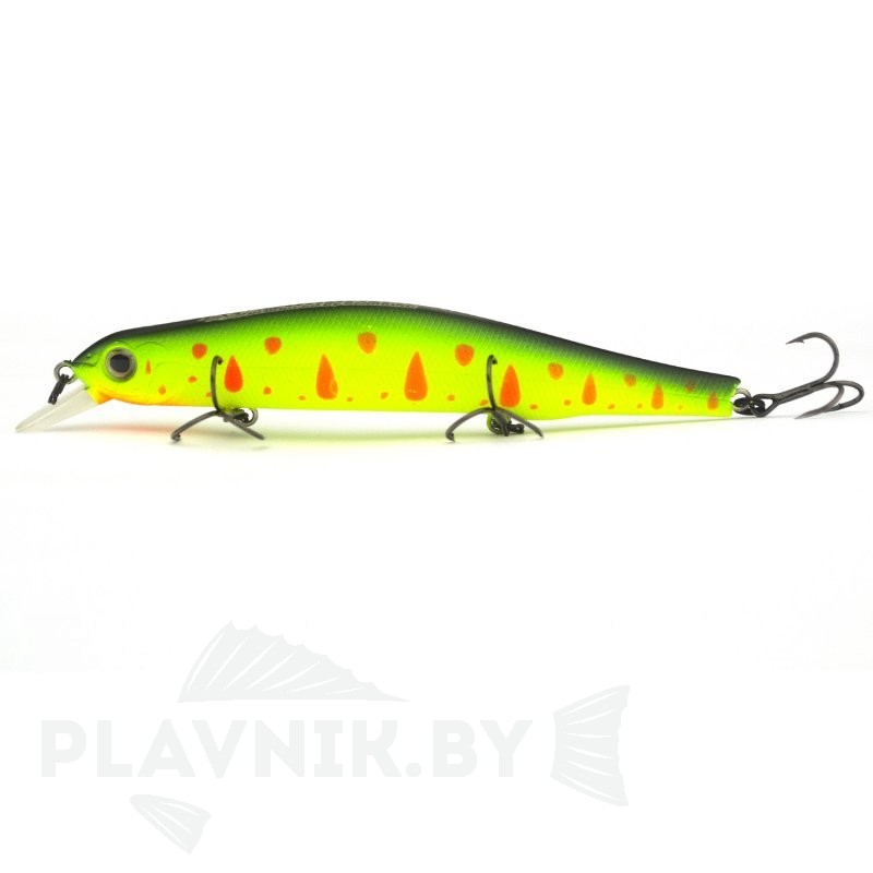 Воблер абсолютно бесшумныq, подойдет для ловли осторожного хищника. Длина воблера составляет 11 см, вес 17 гр, заглубление от 0,8 до 1,2 метра. Плавучесть — суспендер. Лучший способ анимации — это твичинг, хотя можно использовать и равномерную проводку, потяжки, Stop & Go.