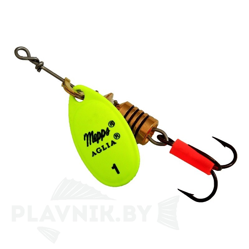 Лепестки Fluo хорошо видны, даже при освещении ультрафиолетовыми лучами, доходящими до самых больших глубин. Стимулированные ультрафиолетом, они продолжают долго светиться, даже когда другие цвета полностью исчезают из видимости. Эти приманки очень удобны также в мутной воде и при плохой погоде. Aglia Fluo оснащена лепестками с очень яркой матовой окраской, дающей преимущество при ловле в темное время суток, на большой глубине и в мутной воде. Кроме того, Mepps в информационном материале часто публикует фотографии погруженной в воду панели, на которой размещены клейма, окрашенные в цвета этой разновидности Aglia. Все они изменяются более или менее значительно, а некоторые вообще становятся неузнаваемы. Например, розовый (pink) приобретает ярко-голубой оттенок, кроме того окраска вращающегося лепестка в воде кажется несколько мягче, чем в воздушной среде, при солнечном освещении. Такая наглядная информация лишний раз предупреждает рыболова о недопустимости категоричных оценок в еще очень мало изученной области физиологии рыб. Aglia Fluo — лишнее тому подтверждение. Многие её разновидности с успехом применялись и в прозрачной воде, на очень незначительных глубинах. Вероятнее всего, на первое место надо поставить тщательное изучение особенностей каждого конкретного водоема, разумеется и не забывая при этом общие рекомендации.