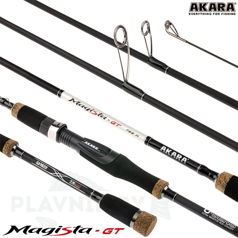 Спиннинг Akara Magista GT (21-62) – джиговый тубулар спиннинг средне-быстрого строя, новинка 2020-го года. Это обновленная линейка уже зарекомендовавших себя спиннингов Akara Magista, исполнена с использованием современных технологий. Cпиннинги собраны на основе бланка из высокомодульного карбона TX-30 (40-ton) производства Японско-го концерна Toray. При производстве используется современная технология UPIT (Under Pressure Innovative Technology) при которой бланк спиннинга накатывается под давлением в термической камере. Использование данной технологии позволяет создать бланки с минимальным количеством связующего вещества и высокой плотности скручивания. Это делает спиннинги звонкими, чувствительными, при полном сохранении прочностных характеристик. Катушкодержатель имеет эргономичную форму, выполнен из высокопрочного пластика, что исключает люфты при установке катушки и обеспечивает удобный и надежный хват во время ловли. Данные спиннинги оснащены облегченными кольцами из оксида циркония Kujira XR Long Super Hard ZrO2 (1600-1800H, kg/mm2) расставленными по технологии New Guide System, которая позволяет оптимально расположить кольца на бланке, определить их количество и размер (вес). Подходит как для ловли с лодки, так и с берега.
