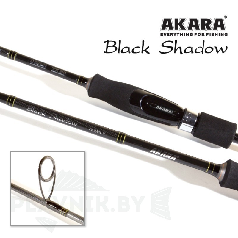 Akara Black Shadow - спиннинг быстрого строя для ловли на джиг и твич. Удилище хорошо отзывается на приманки в диапазоне 3,5-10,5 г. Чистый контактник. Как по строю, так и по быстроте работы бланка. Разнесенная EVA ручка и специальные кольца Kujira Super Contact ZrO2 хорошо передают чувствительность бланка. Таких характеристик удалось добиться благодаря использованию при его производстве технологии U-SENS. Бланк спекается при помощи высокомолекулярной порошковой смолы, количество связующего вещества при этом удается снизить на четверть. Black Shadow подходит как для ловли с лодки так и с берега. Материал - графит Toray марки TX-30 (40-ton)