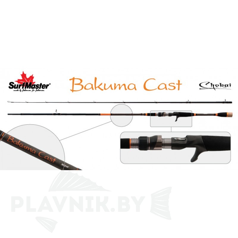 Мощное джерковое удилище Bakuma Cast – универсальный кастинговый спиннинг для контактных видов ловли: heavy джиг, light джерк, твич. Преймущества джеркового удилища Surf Master Bakuma: позволяет применять тяжелые и объемные приманки., сбалансированный бланк из высокомодульного карбона быстрого строя, позволяет выполнять точные и дальние забросы. выдерживает повышенные нагрузки, позволяет рыбачить «через траву» и справиться с рыбой любого размера., оснащается низкопрофильными облегченными усиленными пропускными кольцами Kujira XR для ловли с прочными плетенными шнурами., нагрузка на бланк оптимально распределена, благодаря растановки колец по технологии New Guide System. Сохраняется высокая чувствительность при проводке. эргономичная неопреновая рукоять обеспечивает надежный хват, что важно в борьбе с трофеями.