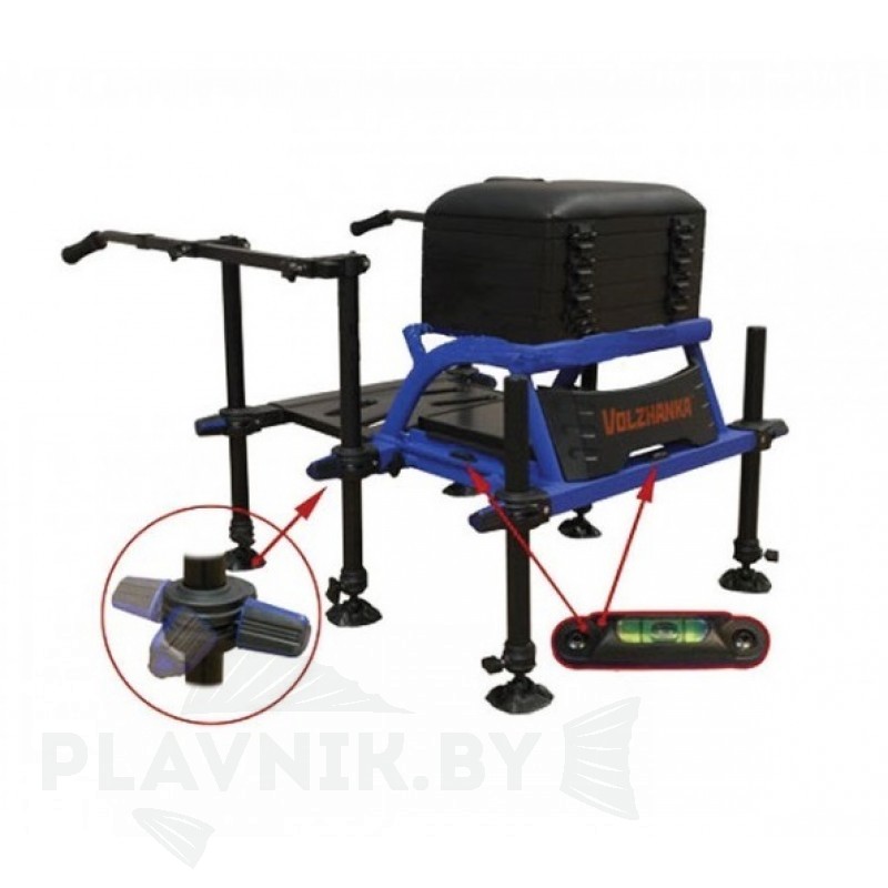 Сиденье с выемкой под комель удилища изготовлено из плотного пенополиуретана и обтянуто прочным PU-кожзаменителем. Для ровного расположения платформы на берегу в ее конструкции предусмотрены два жидкостных уровня. В базовой комплектации платформа рассчитана на рыболова весом 115 кг и ростом 180 см.