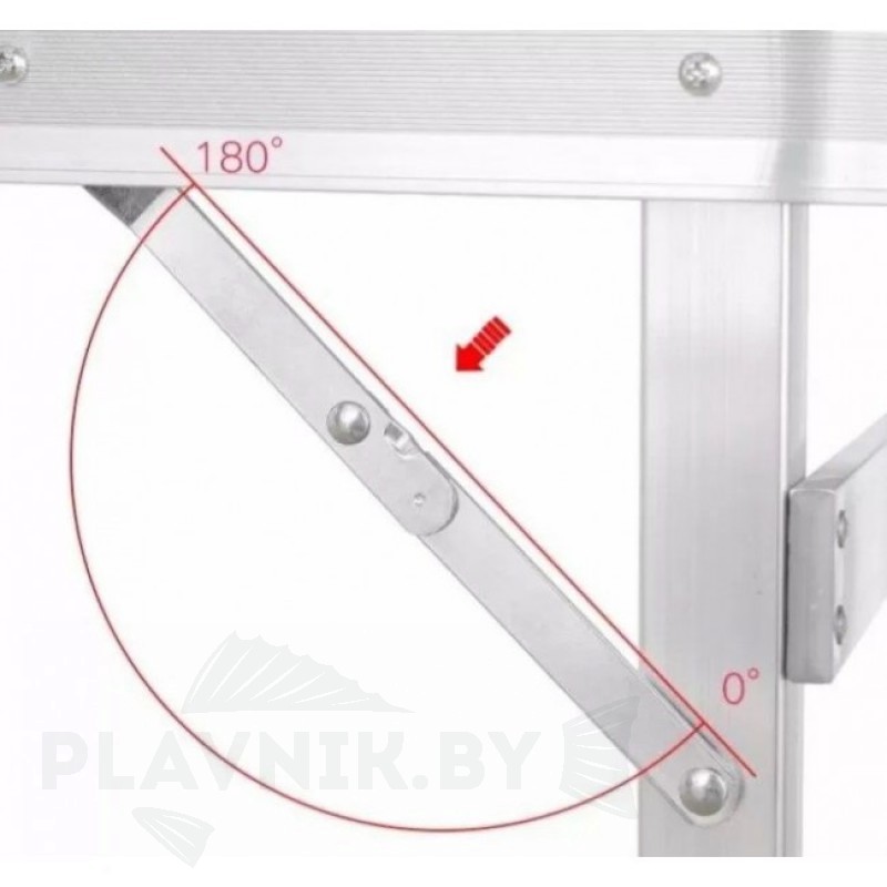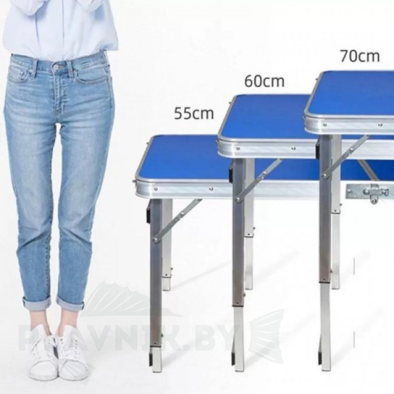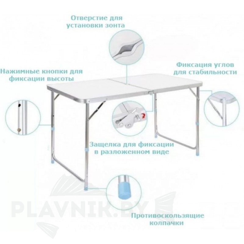Набор из усиленного складного стола и четырех стульев. Складной стол для пикника это ваш комфорт отдыха на природе в лесу или на пляже возле озера. Изготовлен из алюминиевого сплава и выдерживает нагрузку на стол до 50 кг и на каждый стул до 100 кг. Быстро складываются в компактный кейс весом в 7.2 кг. За столом могут комфортно разместиться до 6 человек. Надежная конструкция стола при правильной эксплуатации прослужит Вам долгие годы. Размер столешницы 120х60, с регулировкой по высоте 50/60/70 см., размер стульев 30х24, высота 35 см.