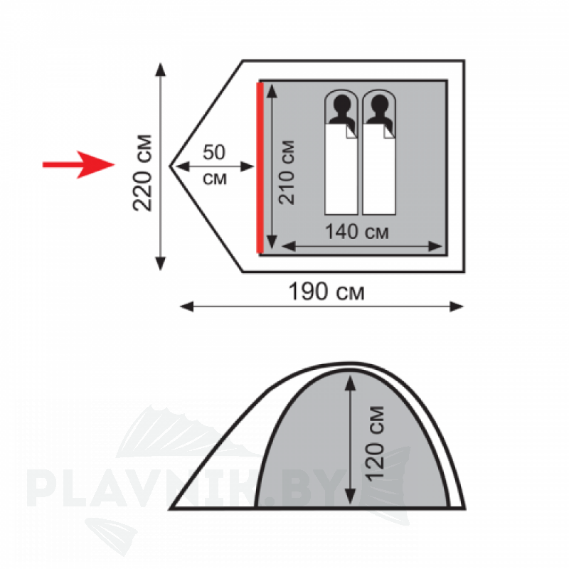 Тент – водонепроницаемый, устойчивый к растяжению, с двумя складными вентиляционными окнами. Обработан составом для поглощения UF лучей и пропиткой, предотвращающей распространение огня. Оборудован растяжками с вплетением светоотражающей нити и проклеенными швами.