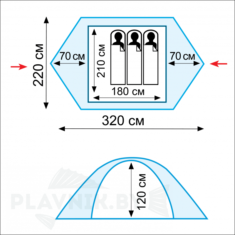 Вентилируемые клапаны, расположенные по периметру конструкции, обеспечат прохождение света и воздуха. D – образные входы с тамбурами на двузамковых молниях продублированы москитной сеткой. Штатно в палатке могут одновременно разместиться 3 человека, но при укладке по принципу «вальта» можно вместить 4 человека. Комплектация: сумка – чехол с удобными ручками для транспортировки, комплект колышков и дуг, полка и ремкомплект.