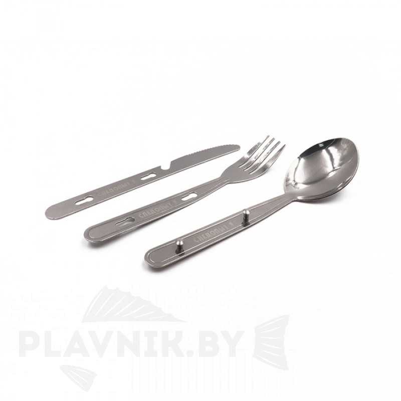 Удобный набор столовых приборов из нержавеющей стали. В набор входят: ложка, вилка, нож с открывалкой.