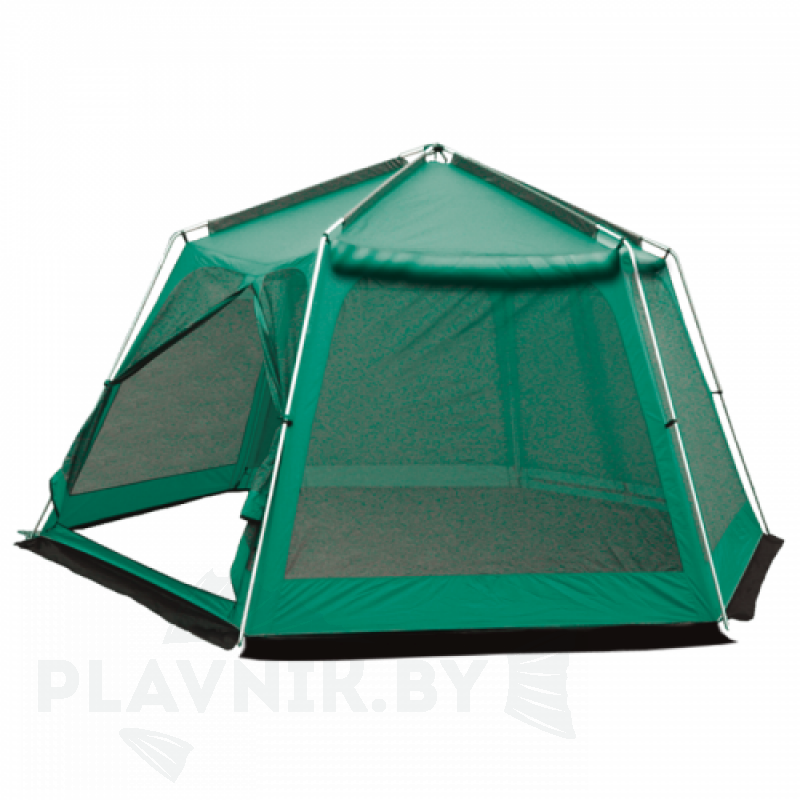 Стены тента выполнены из антимоскитной сетки c убирающейся защитой от дождя на молнии, шатёр имеет многогранную форму. Оборудован двумя входами и ветрозащитной юбкой. Шатер отлично подходит для отдыха на открытом воздухе в летнее время, спасает от легкой непогоды, солнца и насекомых. Специальная пропитка, задерживающая распространение огня - залог безопасного соседства с костром. При всей простоте конструкции, шатер имеет прочный стальной каркас, удобная сумка для переноски с крепкими ручками защитит её от повреждений, пыли и грязи во время перевозки или хранения.