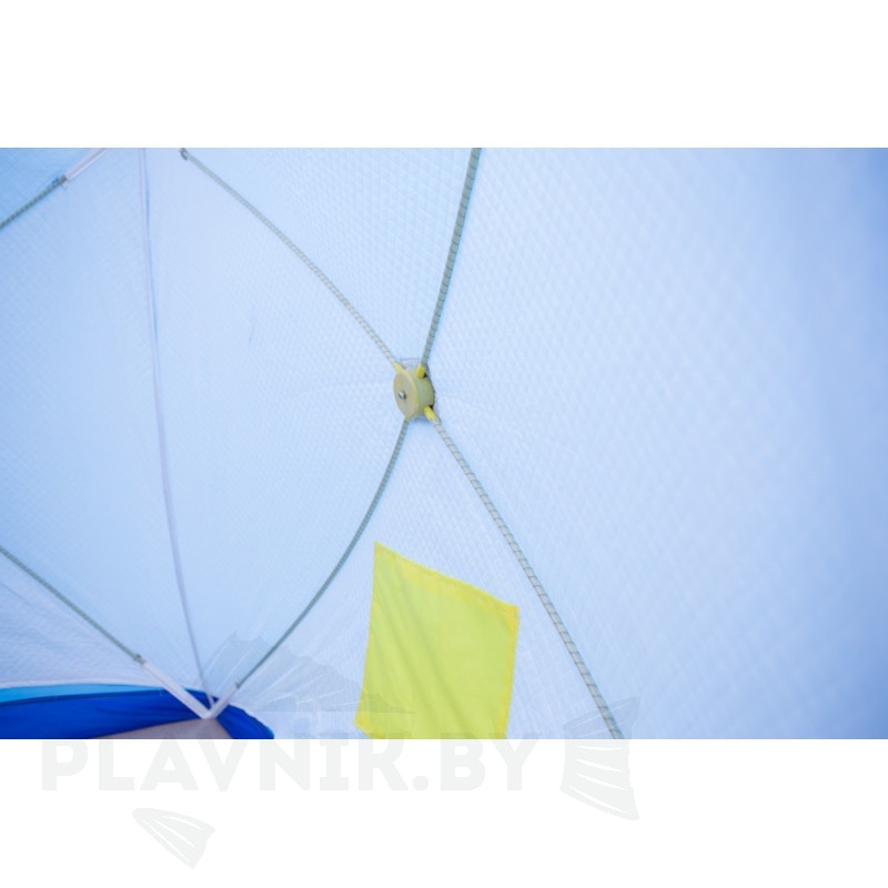 Прочный каркас палатки выполнен из фибергласса (стеклопластик) с добавлением карбона. Этот материал хорошо амортизирует и поэтому не боится ветровых нагрузок. Также он имеет минимальный вес (в сравнении с дюралевыми каркасами), что очень удобно при ходовой рыбалке, когда палатку приходится переносить на себе. Тент изготовлен из синтетической непродуваемой ткани (оксфорд 240PU). Внутренний тент стеганое полотно из синтепона и подкладочной ткани таффета (термостëжка). Оксфорд и термостёжка не склеены и не стеганы между собой, что позволяет создавать пространство для создания воздушно - тепловой подушки. Так же это позволяет удалять образующий конденсат и просушивать палатку. Снаружи расположена сплошная ветрозащатная юбка.