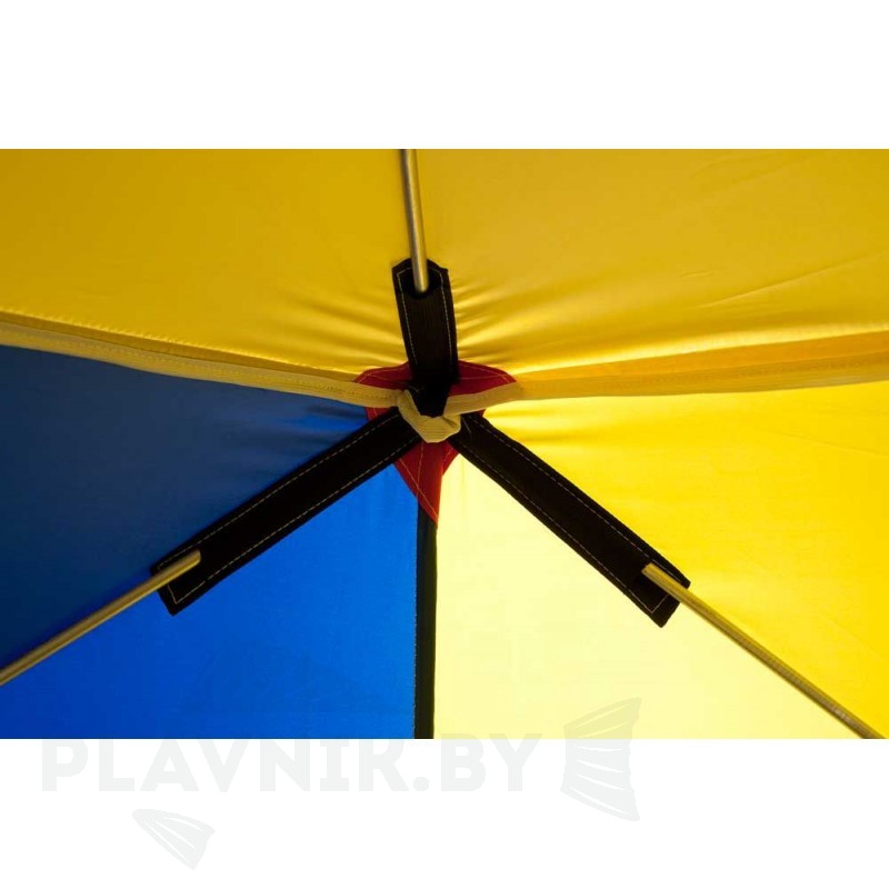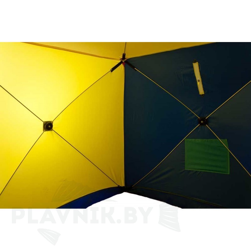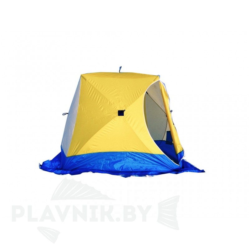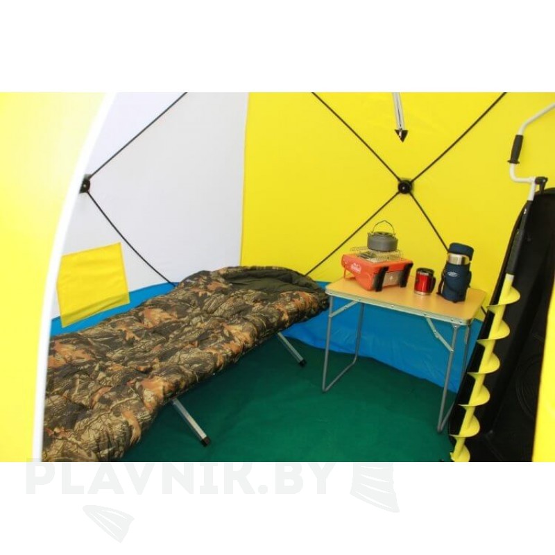 Прочный каркас палатки выполнен из фибергласса (стеклопластик) и обеспечивает сохранение кубической формы даже при сильном ветре. Прочная водостойкая непродуваемая ткань тента (окфорд 300D) надежно защитит от ветра и атмосферных осадков. Тент палатки выполнен из ткани, которая позволяет пропускать дневной свет во внутрь палатки, благодаря чему рыболов имеет возможность ловить рыбу в дневное время без подсветки дополнительными осветительными приборами. Вентиляционное окно закрывается на молнию. Снаружи расположена сплошная ветрозащатная юбка с петлями под ввертыши.