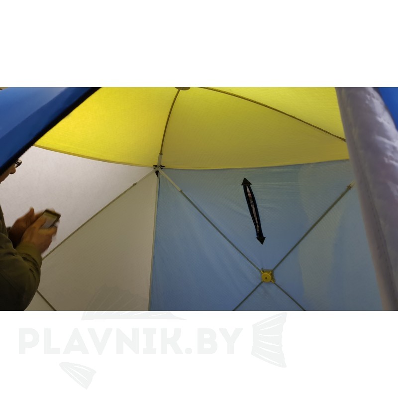 Прочный каркас палатки выполнен из фибергласса (стеклопластик) с добавлением карбона. Этот материал хорошо амортизирует и поэтому не боится ветровых нагрузок. Также он имеет минимальный вес (в сравнении с дюралевыми каркасами), что очень удобно при ходовой рыбалке, когда палатку приходится переносить на себе. Прочная водостойкая непродуваемая ткань тента (оксфорд 300PU) надежно защитит от ветра и атмосферных осадков. Нижний тент стеганое полотно из синтепона и подкладочной ткани таффета (термостежка). Ткань таффета обладает водо- и грязеотталкивающими свойствами. Устойчива к истиранию и механическим воздействиям. Тент палатки выполнен из ткани, которая позволяет пропускать дневной свет во внутрь палатки, благодаря чему рыболов имеет возможность ловить рыбу в дневное время без подсветки дополнительными осветительными приборами. Вентиляционное окно закрывается на молнию. Снаружи расположена сплошная ветрозащатная юбка.