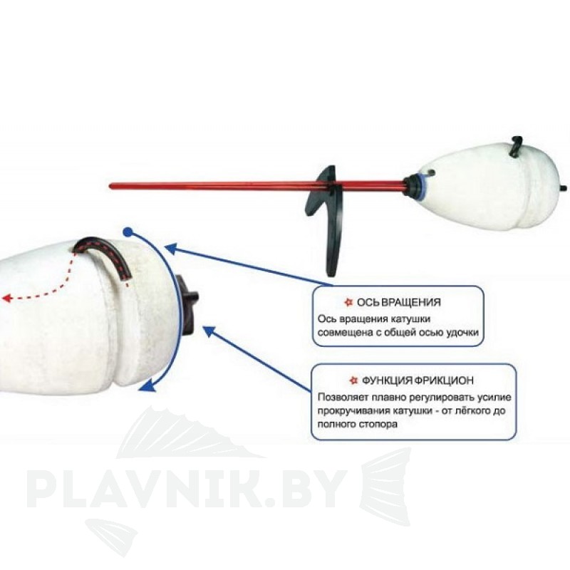 - Ось вращения катушки совмещена с общей осью удочки.